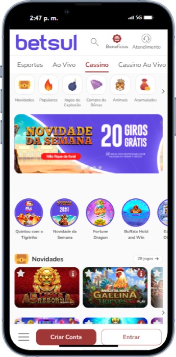 Acesse o site da Betsul e entre no ícone de benefícios, que fica no topo da tela. Entre na seção de cassino e confira as promoções disponíveis.
