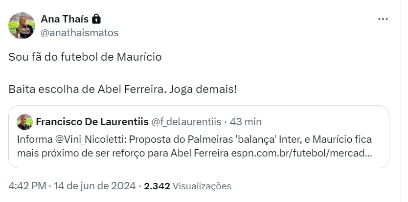 “Sou fã do futebol de Maurício. Baita escolha de Abel Ferreira. Joga demais!”, escreveu Ana Thaís Matos, na plataforma X.
