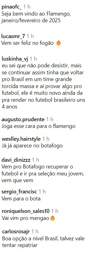 “eu sei que não pode desistir, mais se continuar assim tinha que voltar pro Brasil em um time grande torcida massa e aí provar algo pro futebol, ele é muito novo ainda da pra render no futebol brasileiro uns 4 anos”