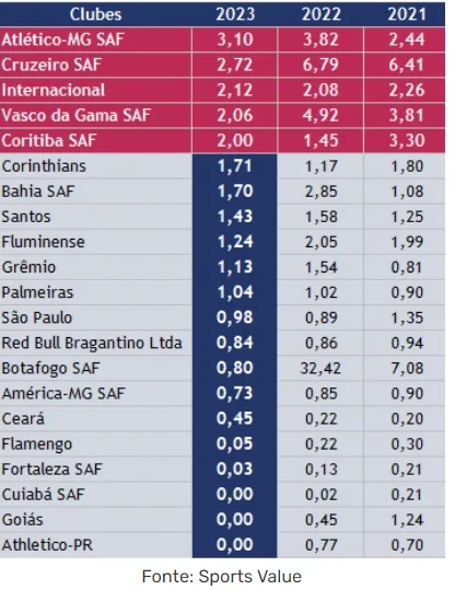 Da lista acima, apenas quatro clubes estão acima do índice citado pela Sports Value. A média dos 20 times foi de 1,15 em 2023.