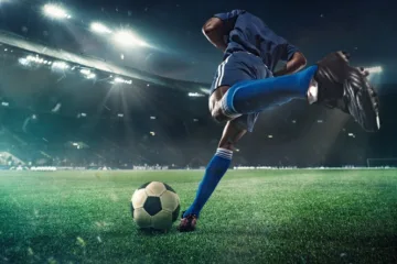 Imagem ilustrativa de um jogador de futebol chutando uma bola no plano de fundo. Em primeiro plano aparece o logo da Sportingbet.