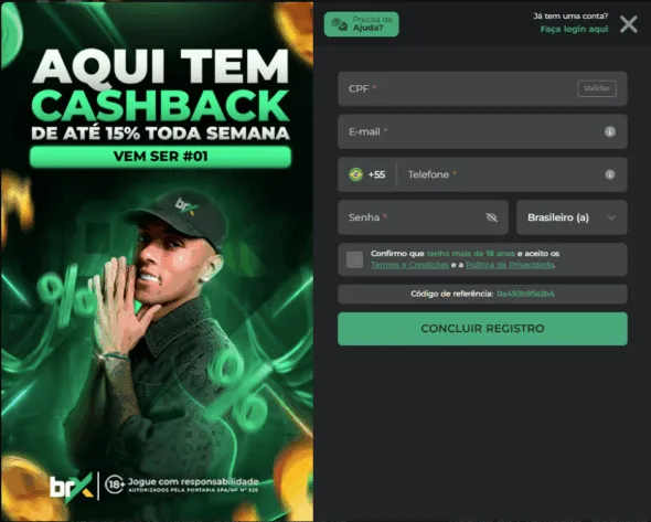 O código promocional da BrxBet não é colocado no processo de cadastro, como funcionava antes do novo regulamento. Consulte o suporte da operadora para mais informações, caso você possua um promo code para utilizar.