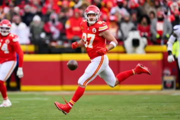 Associated Press / Alamy Stock Photo | O tight end do Kansas City Chiefs, Travis Kelce, em 18 de janeiro de 2025, em Kansas City, Missouri