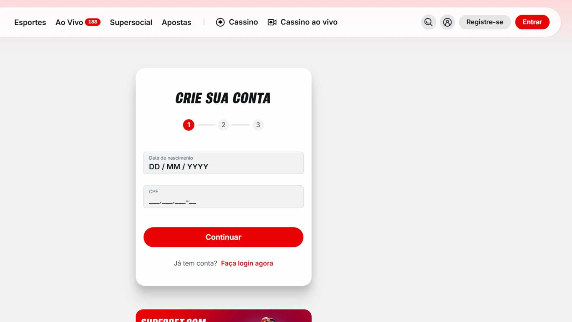 - Somente pessoas maiores de 18 anos podem criar uma conta na Superbet;