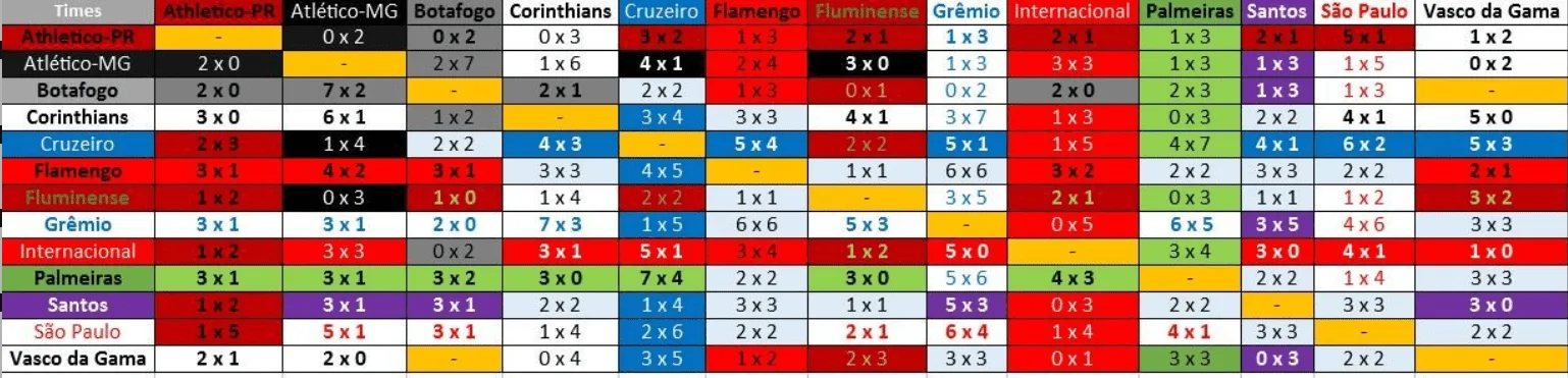 A leitura da tabela é simples: escolha uma linha e uma coluna e pronto. Por exemplo: no duelo entre Cruzeiro e São Paulo, que acontecerá pela semifinal da Copa do Brasil, os mineiros têm uma larga vantagem na história. Foram seis vitórias e apenas duas eliminações.