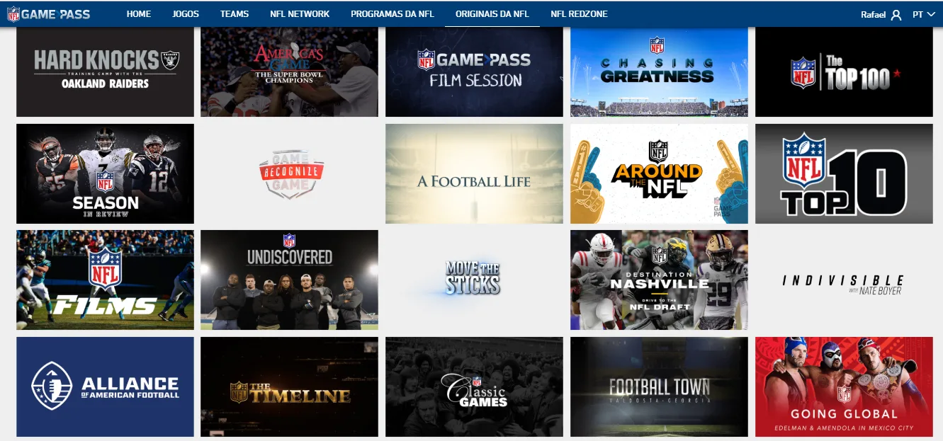 Outras produções originais da NFL disponíveis sob demanda são: Classic Games, Going Global, NFL Films, NFL Undiscovered (com participação de Duzão), Around the NFL, Hard Knocks e diversas outras. O catálogo é imenso.