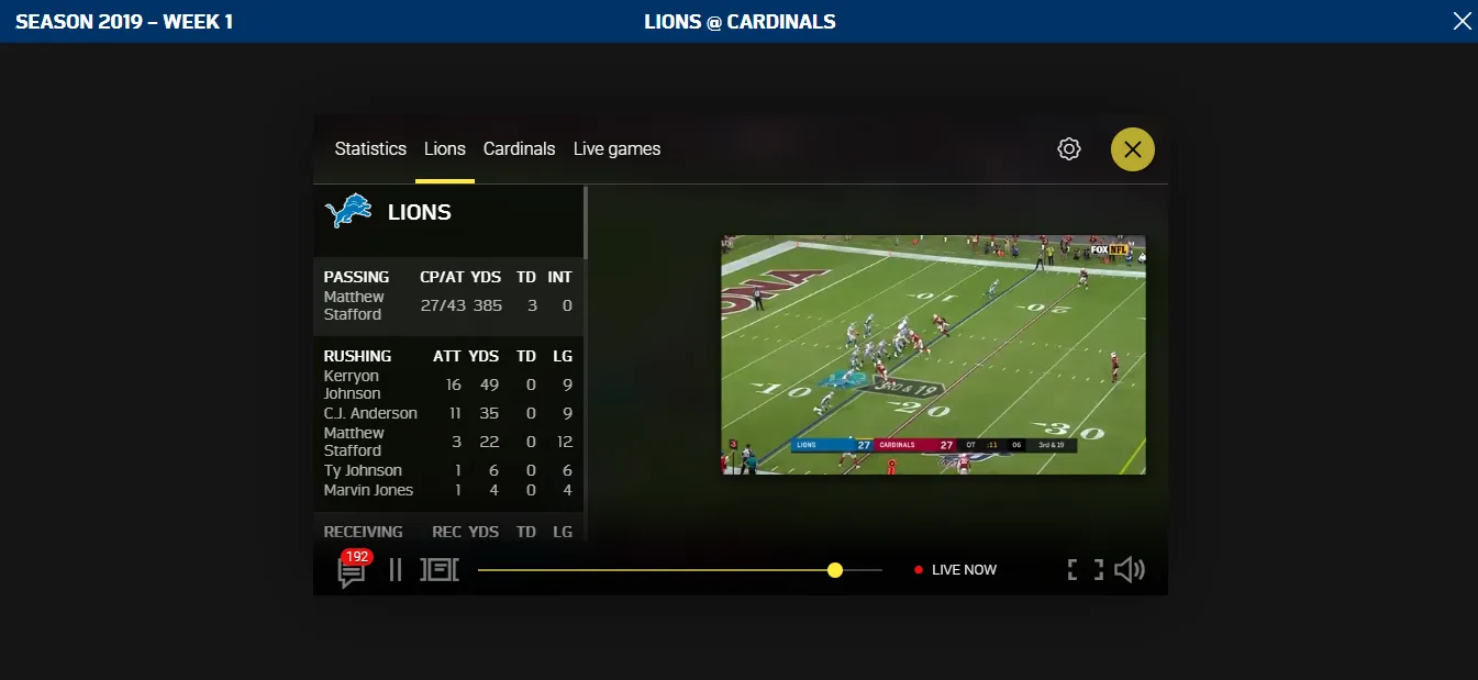 Outro fator interessante presente na transmissão ao vivo do NFL Game Pass são as estatísticas ao vivo. Durante a partida, todos as estatísticas como avanços, jardas totais, passes, interceptações e muitas outras estão disponíveis ao usuário e são atualizadas em tempo real.