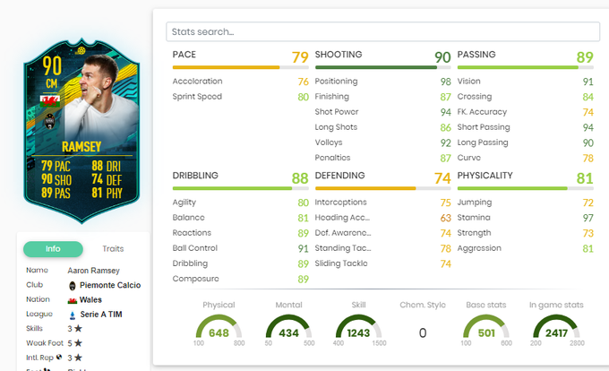 Apesar da carta ter ótimos números, apenas os stats de cabeceio abaixo de 72, Ramsey não é um jogador tão acima da média. Ele é consistente, regular em tudo, com ótimo chute e passe. Porém, não é um bom volante e nem um bom meia ofensivo. É muito fraco para defender e pouco ágil para atacar. Essa agilidade (e a velocidade) também pode comprometer caso você queria usá-lo como segundo volante (box-to-box).
