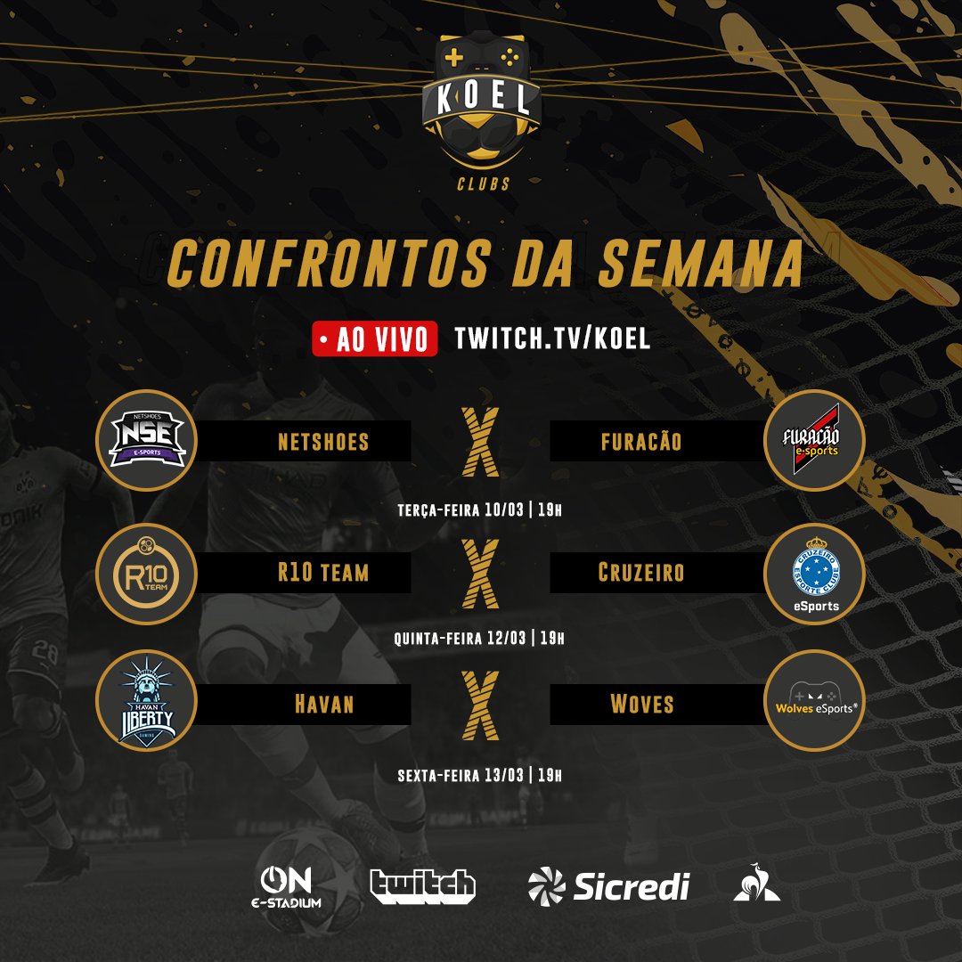 Teremos uma semana cheia de jogos, porém apenas três com transmissão ao vivo. Nesta terça-feira (10), Netshoes enfrenta o Furacão. Já na quinta-feira (12), o Cruzeiro duela contra o R10 Team. Para fechar o calendário semanal, Havan e Wolves jogam na sexta-feira (13). Você pode acompanhar pelo canal da KOEL na Twitch.