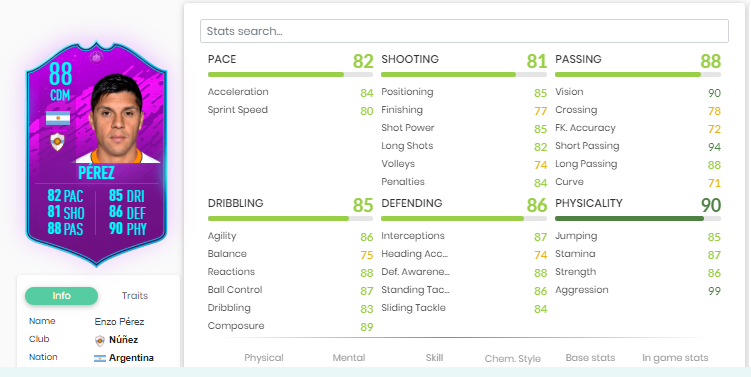 A melhor escolha é Enzo Pérez (88). O meia do River tem uma carta fenomenal. É realmente um jogador completo, tendo 81+ em todos os stats gerais. Destaque para 99 de agressividade, 94 de passe curto e 89 de frieza.
