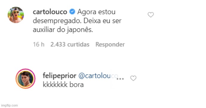 Por fim, ele mostrou que vem ampliando seus horizontes na vontade de ter um novo trabalho. Diante disso, até mesmo Felipe Prior, ex-participante do BBB, recebeu uma mensagem. Sendo assim, ele acabou ficando “tentado” a conceder a vontade do Cartolouco.