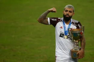 Gabriel Barbosa, do Flamengo, segura o troféu da Taça Guanabara entre Flamengo e Fluminense (Wagner Meier/Getty Images)