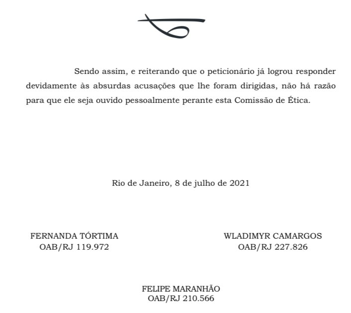 I) Não reconhece esta Comissão de Ética como um órgão legítimo e competente para decretar o seu afastamento provisório do cargo de Presidente da CBF; II) Não prestará depoimento no âmbito de processo eivado de nulidades e constituído por provas ilícitas e testemunhos evidentemente parciais.