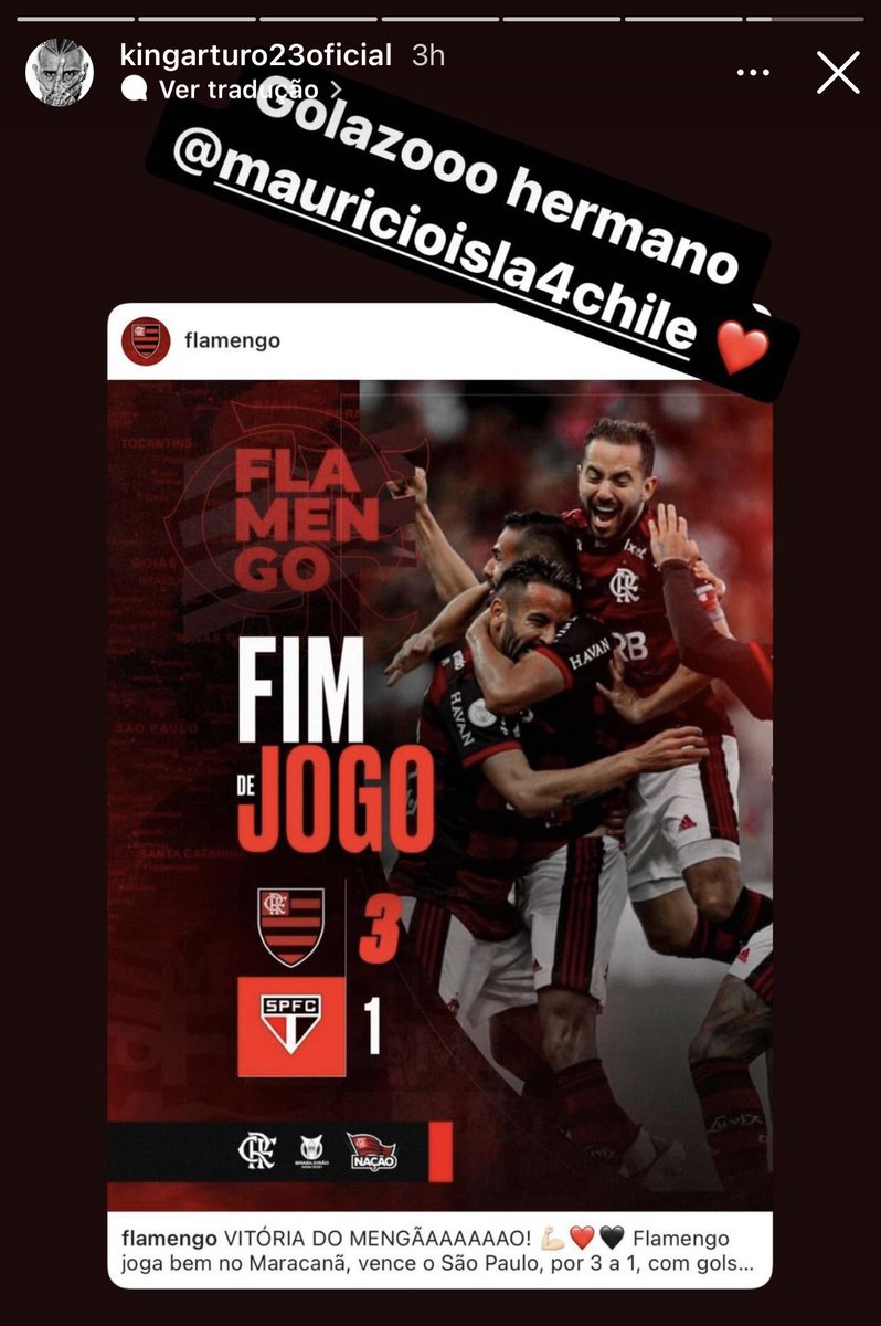 Na publicação onde o Flamengo, em seu perfil no Instagram, usou a arte da vitória sobre o São Paulo pelo placar de 3 a 1, o jogador compartilhou o post em suas redes sociais e ainda mandou um recado para Mauricio Isla, que é seu companheiro de seleção. “Golazo hermano”, escreveu Vidal, marcando o perfil pessoal de Isla no Instagram.
