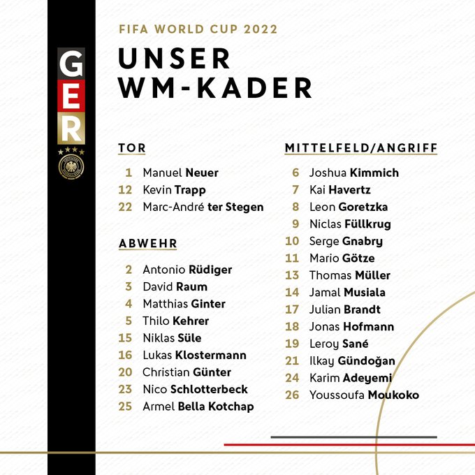 Se em 2018 a Alemanha contava com Khedira, Kroos, Özil, Boateng, Rudy e Hector, em 2022 o time irá com Bella-Kotchap (20 anos), Havertz (23 anos), Musiala (19 anos), Adeyemi (20 anos) e Moukoko, que fará 18 anos no dia da abertura da Copa do Mundo.