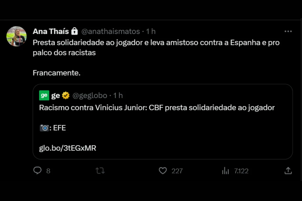 “Presta solidariedade ao jogador e leva amistoso contra a Espanha e pro palco dos racistas. Francamente”, disparou Ana Thaís.