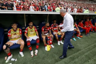 Tite e os jogadores do Flamengo no banco de reservas