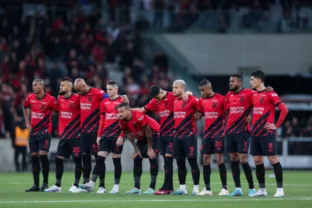 CURITIBA, BRAZIL - AUGUST 08: Players of Athletico Paranaense observe the penalty shootout during the Copa CONMEBOL Libertadores round of 16 second leg match between Athletico Paranaense and Bolivar at Ligga Arena on August 08, 2023 in Curitiba, Brazil. (Photo by Heuler Andrey/Getty Images)
