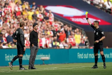 Créditos: 06.08.2023IMAGO Bildnummer: 10329282014451x2838 PixelIMAGO / PA ImagesArsenal v Manchester City - FA Community Shield - Wembley Stadium Referee Stuart Attwell shows a yellow card to Arsenal manager Mikel Arteta during the FA Community Shield match at Wembley Stadium, London. Picture date: Sunday August 6, 2023. EDITORIAL USE ONLY No use with unauthorised audio, video, data, fixture lists, club/league logos or live services. Online in-match use limited to 120 images, no video emulation. No use in betting, games or single club/league/player publications. PUBLICATIONxNOTxINxUKxIRL Copyright: xNickxPottsx 73255343