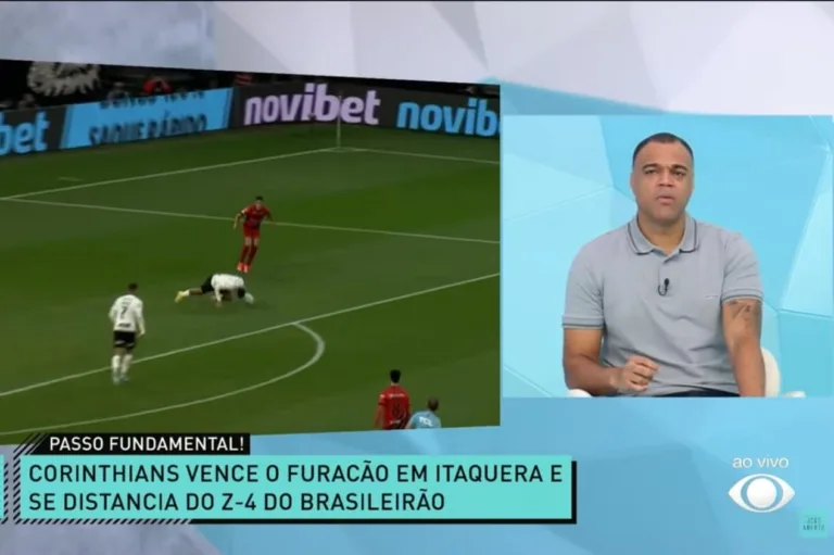“Para mim, pênalti claríssimo. Erro técnico do Bidu. Não tem essa de bola perto ou bola longe. Ele tenta ir de cabeça, mas a bola pega no braço esquerdo dele, que estava aberto. Sem discussão, para mim o pênalti é claríssimo. Mas, não estou vendo ninguém falar”, disse Denílson.