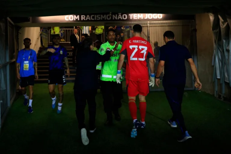 Policiais militares reprimiram os torcedores argentinos. Irritado, o goleiro Dibu Martinez tomou as dores e defendeu os adeptos do seu país. As imagens foram divulgadas pelo canal TYC Sports.