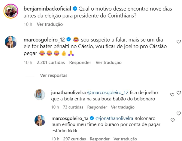 De forma instantânea, a mensagem de Marcos logo se destacou na postagem de Benja. Dessa forma, um internauta chamou o ex-goleiro de ” babão do Bolsonaro”, algo que fez o ídolo do Palmeiras debochar da ligação entre Lula e Corinthians, tendo em vista a dívida existente envolvendo a Neo Química Arena.