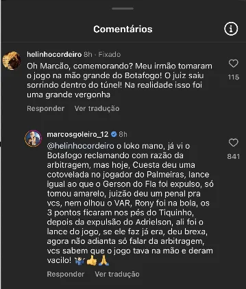 “Já vi o Botafogo reclamando com razão da arbitragem, mas hoje o Cuesta deu uma cotovelada no jogador do Palmeiras, lance igual ao que o Gerson, do Flamengo, foi expulso, só tomou amarelo. Juizão deu um penal pra vocês, nem olhou o VAR, Rony foi na bola, os três pontos ficaram no pé do Tiquinho depois da expulsão do Adryelson. Ali foi o lance do jogo, se ele faz, já era. Deu brecha, agora não adianta só falar da arbitragem, vocês sabem que o jogo tava na mão e deram vacilo“, respondeu Marcos, no Instagram, para um internauta.