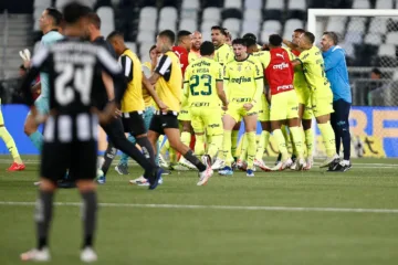 Jogadores do Palmeiras comemoram vitória contra o Botafogo