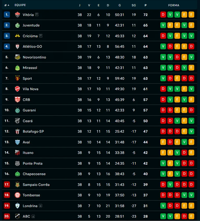 Na parte superior da tabela, o Juventude se juntou ao Vitória e Criciúma, que já haviam sacramentado o acesso, ao bater o Ceará de forma dramática pelo placar de 3 a 1, no Estádio Presidente Vargas, mesmo estando com um homem a menos. Emocionante também foi a redenção do Atlético-GO, que superou o Guarani, em partida marcada por três expulsões.