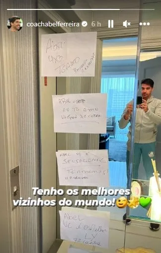 Quem recebeu demonstrações de carinho após a vitória foi o técnico Abel Ferreira. Em suas redes sociais, o treinador do Palmeiras compartilhou bilhetes que recebeu em seu apartamento. Entre as mensagens, “você é o melhor” e “você é sensacional, te amamos!”.
