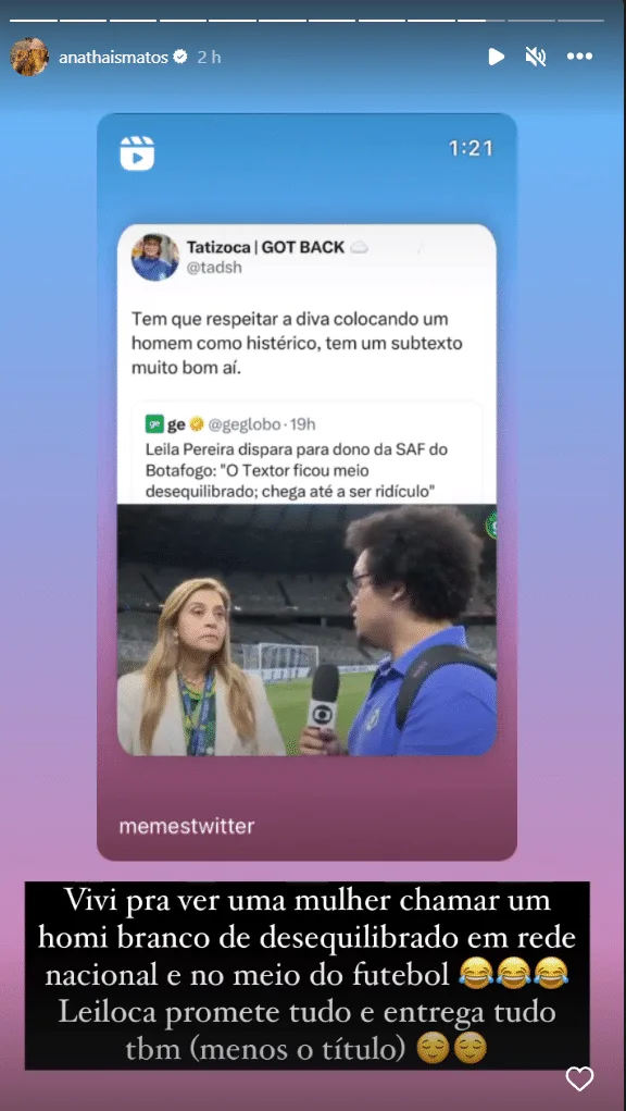 “Vivi pra ver uma mulher chamar um ‘homi’ branco de desequilibrado em rede nacional e no meio do futebol. Leiloca promete tudo e entrega tudo (menos o título)”, escreveu Ana Thaís no Instagram.