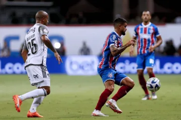 Enquanto o Esquadrão de Aço busca o caminho do gol, o Galo progride diante das falhas do Bahia. Neste momento, 1 a 0 no placar.