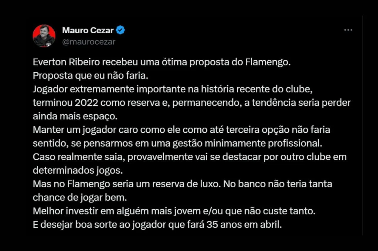 “Everton Ribeiro recebeu uma ótima proposta do Flamengo. Proposta que eu não faria. Jogador extremamente importante na história recente do clube, terminou 2023 como reserva e, permanecendo, a tendência seria perder ainda mais espaço”, iniciou Mauro Cezar.