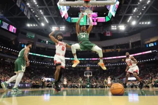 Os Bucks responderam com uma sequência de sextas, incluindo uma bandeja de Atentokounmpo, o que garantiu a vantagem de sete pontos para a equipe do Fiserv Form.