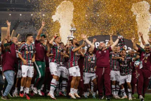 Foto de jogadores do Fluminense celebrando a conquista da Libertadores, que rendeu vaga para o Mundial de Clubes