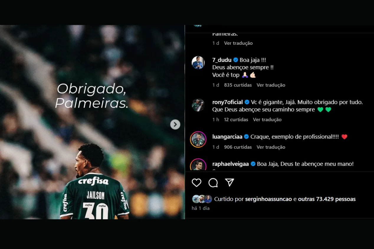 “Você é gigante, Jajá. Muito obrigado por tudo. Que Deus abençoe seu caminho sempre”, disse o atacante do Palmeiras. Além do camisa 10, nomes como Dudu, Luan, Gabriel Menino, Raphael Veiga e outros atletas do atual elenco palestrino se manifestaram no post, todos desejando sorte ao volante.
