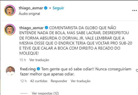 O ex-Globo repudiou a conduta da colega de mídia esportiva. Em comentário na página de Thiago Asmar, o profissional do SBT fez questão de sinalizar que a antiga colega de emissora possui um comportamento de “apenas odiar”.