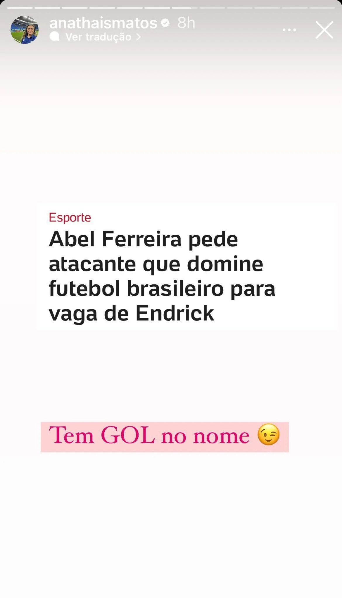 A pedido do técnico Abel Ferreira, a diretoria do Verdão busca um camisa 9 mais experiente, com comprovado faro de gol. Por isso, a comentarista Ana Thaís Matos, da TV Globo, sugeriu um atleta e deixou os torcedores empolgados.