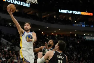 Thompson vai para a cesta na derrota dos Warriors para os Bucks na temporada regular da NBA (Patrick McDermott/Getty Images)