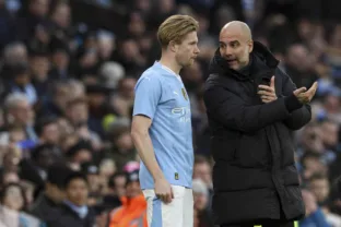 De Bruyne recebe orientações de Guardiola antes de retonar aos gramados pelo City (IMAGO/Colorsport)