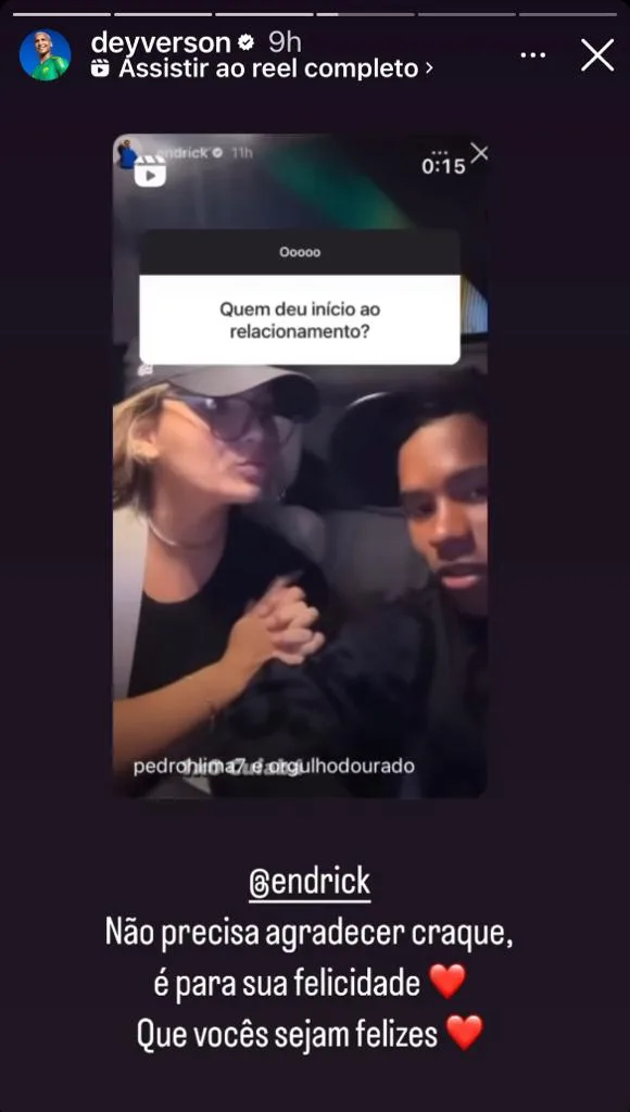 “Não precisa agradecer, craque. É para sua felicidade. Que vocês sejam felizes“, comentou Deyverson na publicação do garoto do Verdão.