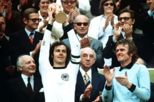 Franz Beckenbauer ergue a taça ao ganhar a Copa do Mundo de 1974 pela Alemanha