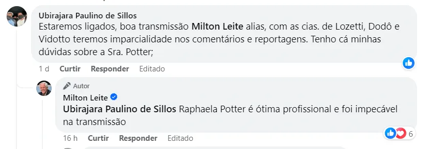 “Estaremos ligados, boa transmissão Milton Leite alias, com as companhias de Lozetti, Dodô e Vidotto teremos imparcialidade nos comentários e reportagens. Tenho cá minhas dúvidas sobre a Sra. Potter”, escreveu.