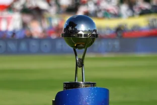 Liga Deportiva Universitaria (LDU) x Fortaleza - Copa CONMEBOL Sul-Americana 2023 Final MALDONADO, URUGUAI - 28 DO OUTUBRO: O troféu é exibido antes da final da Copa CONMEBOL Su-Americana 2023 entre LDU de Quito e Fortaleza, no Estádio Domingo Burgueño Miguel, em 28 de outubro de 2023, em Maldonado, Uruguai. (Crédito: Ernesto Ryan/Getty Images)