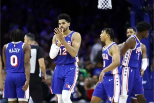 Jogadores dos 76ers durante a derrota para os Mavericks, pela temporada regular da NBA (Tim Nwachukwu/Getty Images)