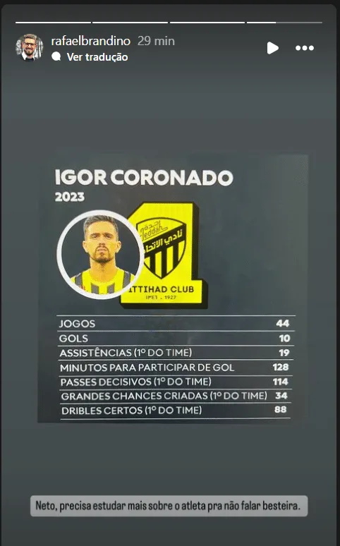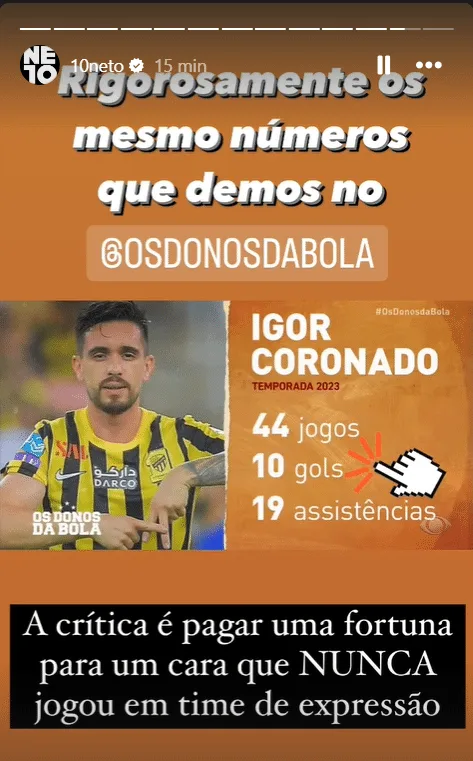 Horas depois, nas redes sociais, Rafael Brandino, empresário de Coronado, rebateu Neto e mostrou os números do jogador na última temporada.