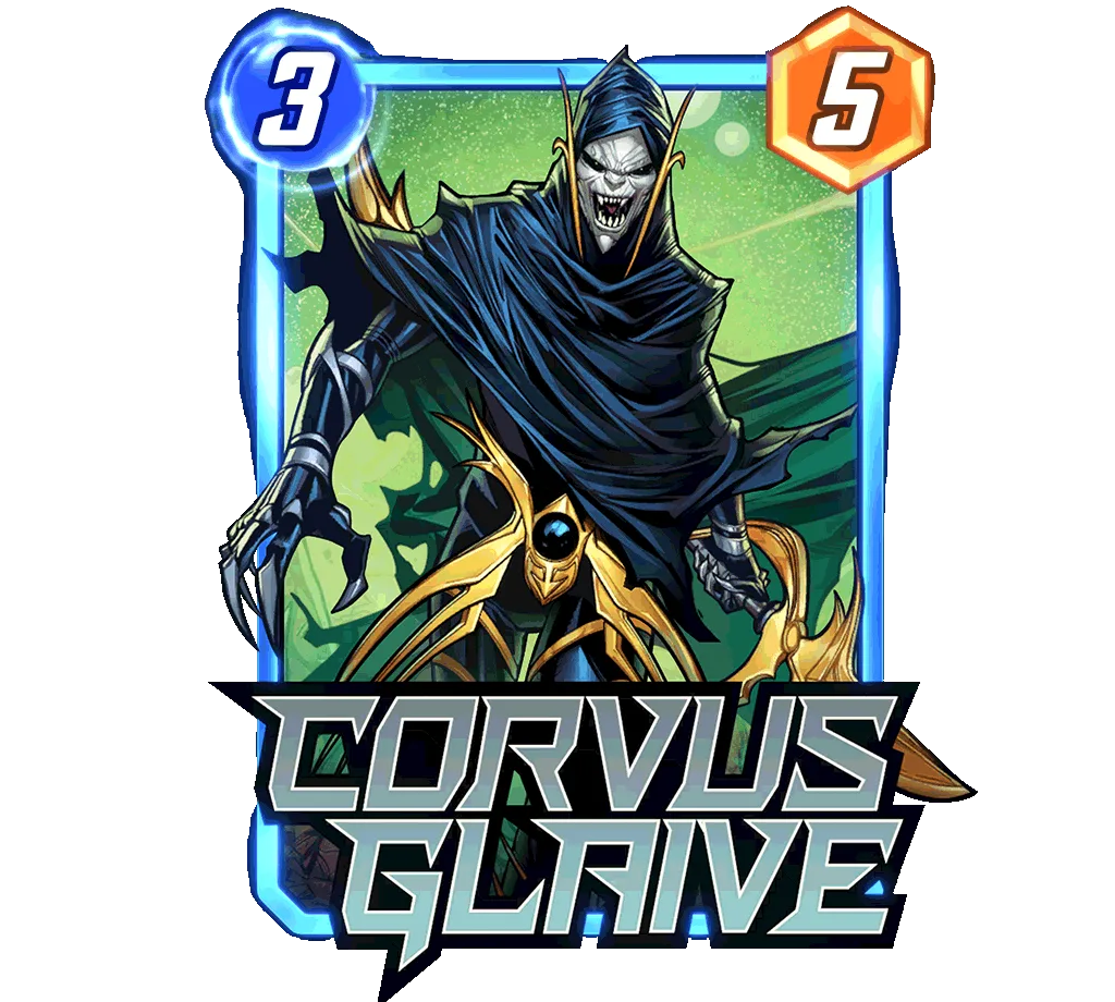 Ao revelar descarta duas cartas de sua mão para aumentar sua energia em um nível. Dentro do game Corvus Glaive pode funcionar bem com decks de descarte ao lado de Morbius e Hela.