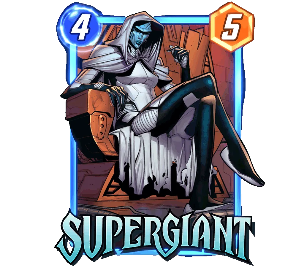 Ao ser revelada, todas as cartas jogadas no próximo turno não serão reveladas até que a partida se encerre. Com a Supergigante você pode tanto proteger / esconder suas cartas como também atrapalhar a estratégia do seu adversário, principalmente em decks que utilizem o Professor Xavier ou Leech.