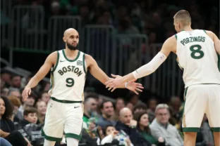 Porzingis cumprimenta White na vitória dos Celtics sobre os Grizzlies, pela temporada regular da NBA (Paul Rutherford/Getty Images)