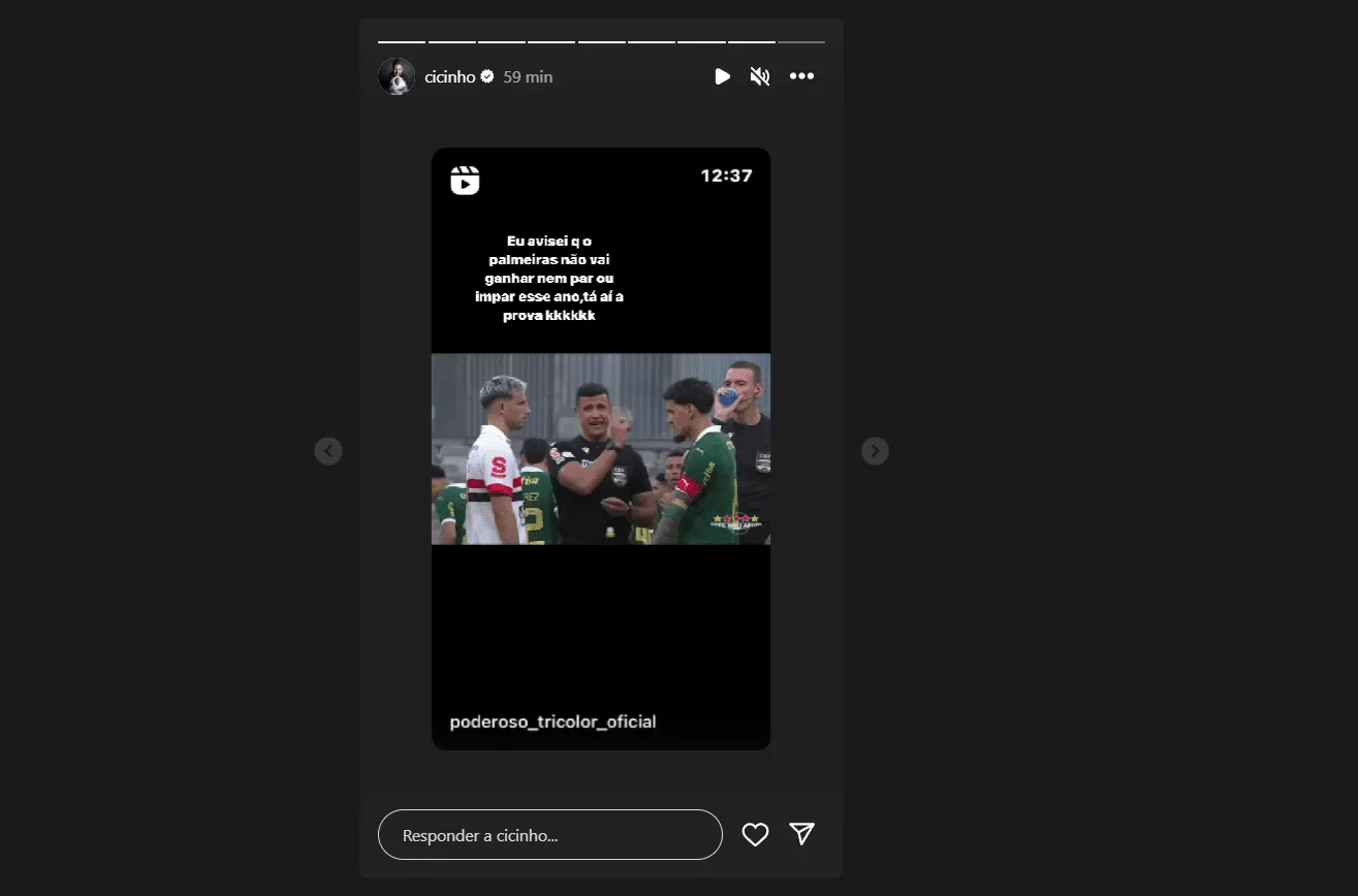 “Eu avisei que o Palmeiras não vai ganhar nem par ou ímpar esse ano, tá aí a prova.” escreveu o ídolo do SPFC, em post no Instagram.